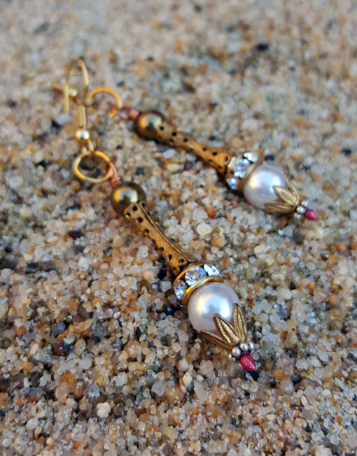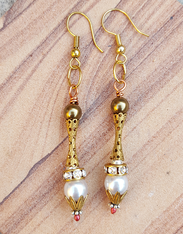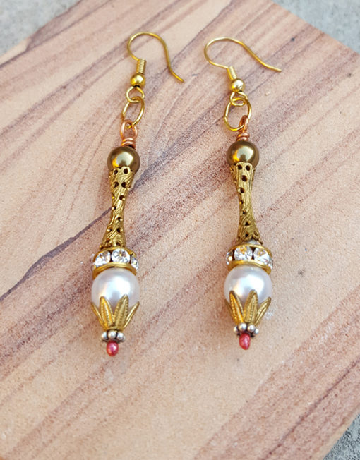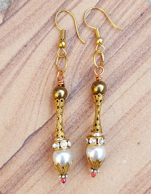 Repurposed brass filigree components paired with Swarovski Crystal Pearls, freshwater pearls, copper, gold and silver?.a dainty french lady with a bit of sass about her. Gold plated open french ear wires.