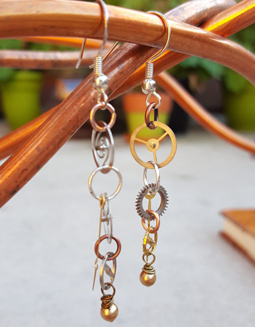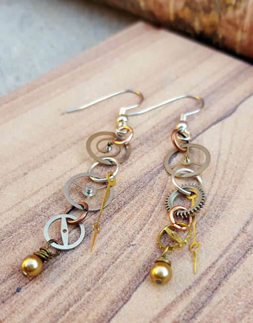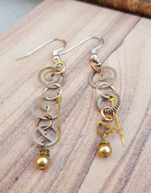 Three graduated watch gears form a good base to hold the vintage watch hand and is finished with a gold Swarovski Chrystal Pearl with open french ear wire.
